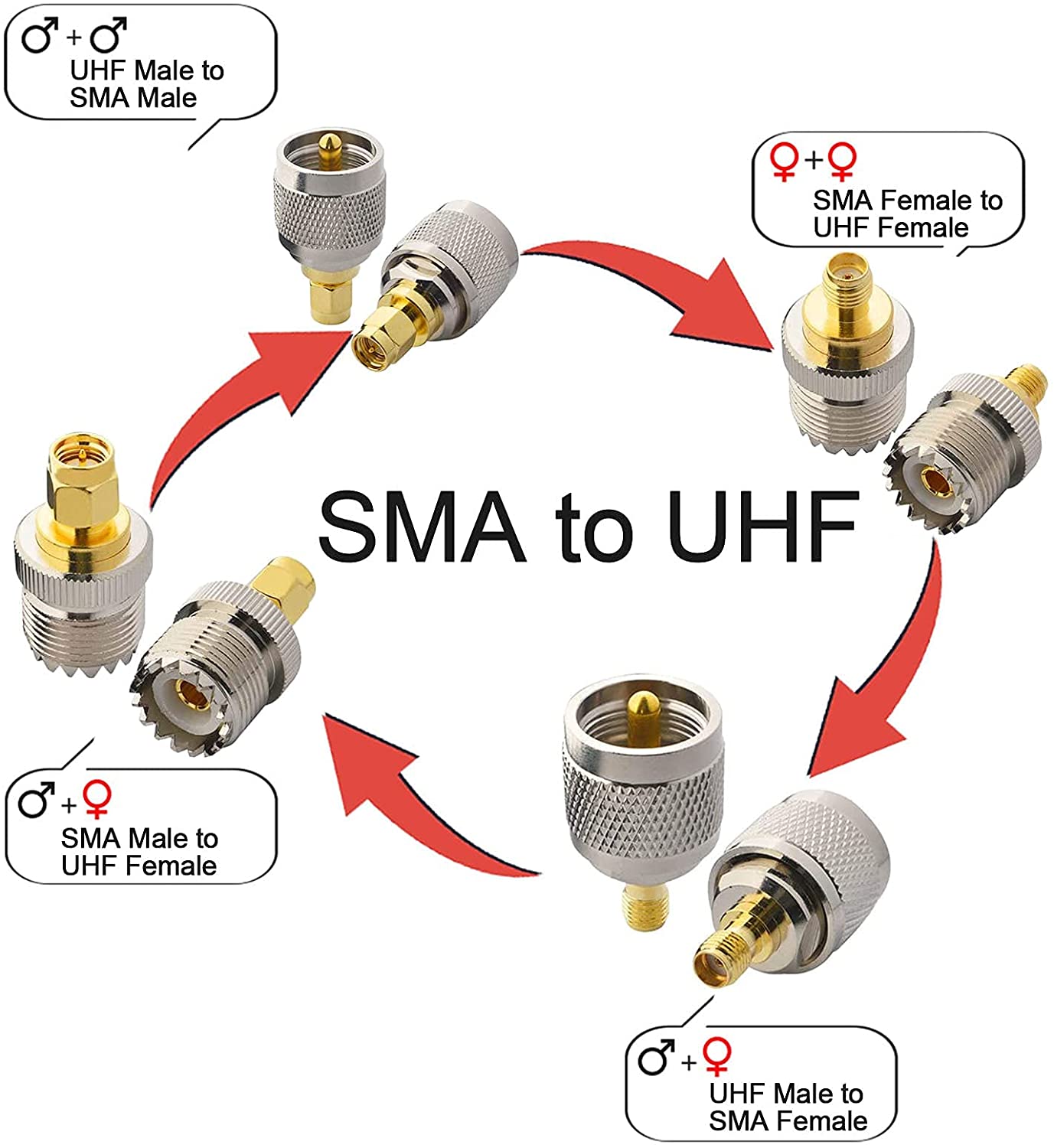- 1. SMA male to UHF male, 2. SMA male to UHF female, 3. SMA female to UHF male, 4. SMA female to UHF female